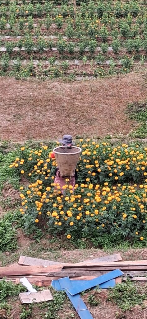 La famille qui tient les cabanes est très sympathique. Les parents préparent le petit déjeuner, le petit garçon de 2 ans fait le timide dans son habit mi spider man mi toys story, international ! Les ouvriers s’affairent à construire une nouvelle cabane, au champs c’est la cueillette des fleurs dans une hotte en osier. Des petits chiots viennent se faire caresser.