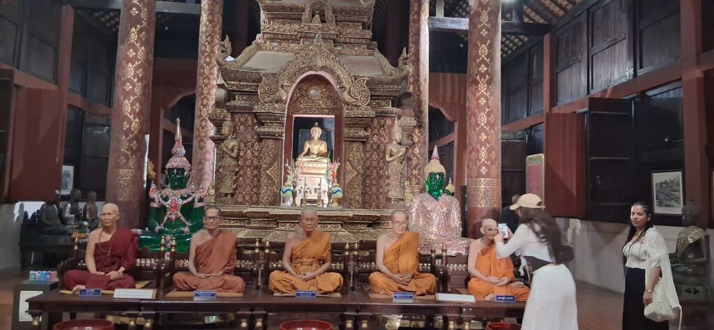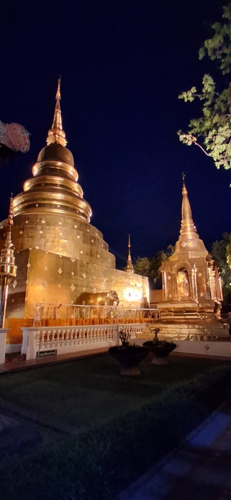 L’hotel se trouve tout près de la vieille ville, une rue à traverser, et ce n’est pas simple vue la circulation ! Un marché en plein air est installé là avec ses stands et ses tables pour manger sur place. On ne résiste pas au mango sticky rice, le dessert Thaï emblématique. Puis on fait un tour de quartier. Lorsque la nuit tombe, les rues, les monuments s’éclairent et tout prend une autre dimension. Les stuppas dorées s’illuminent, brillent dans la nuit. On visite le temple, une des salles contient des statues de moines tellement réalistes qu’on croirait qu’ils vont bouger. C’est rare de voir de vraies représentations humaines, en général on ne voit que des bouddhas ou des animaux.