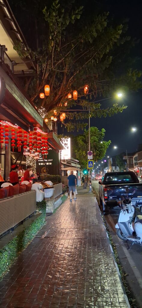 Les rues sont très animées le soir, beaucoup de restaurants, d’hotels, de bars, de salons de massage ouverts très tard. Et aussi beaucoup de temples magnifiques à visiter demain lorsqu’il fera jour et même à revoir en soirée.