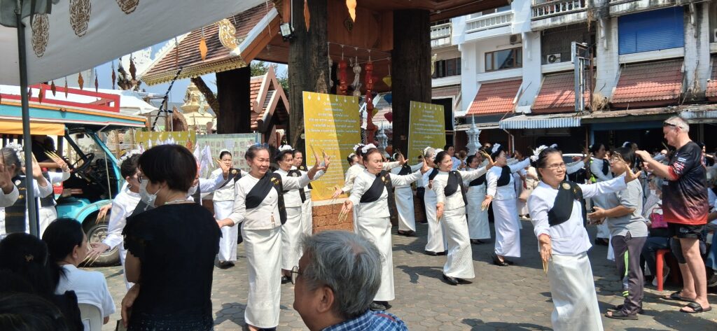 Dans un grand temple a lieu une cérémonie funéraire pour un moine. Les hommes sont plutôt en noir, les femmes en blanc avec une écharpe noire. A la fin de la cérémonie elles effectuent une danse très délicate.