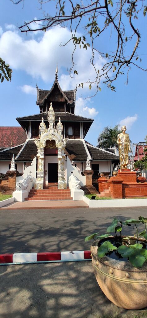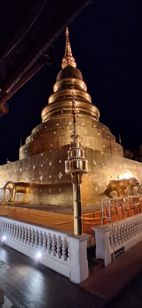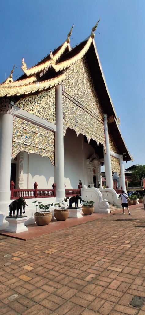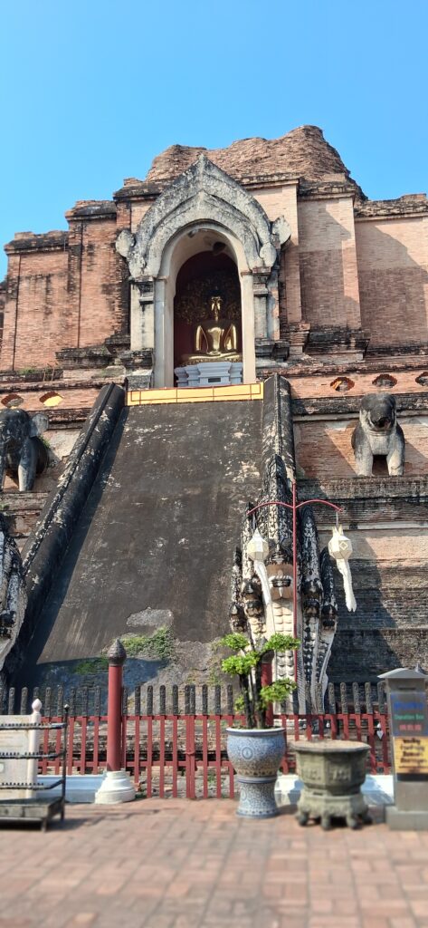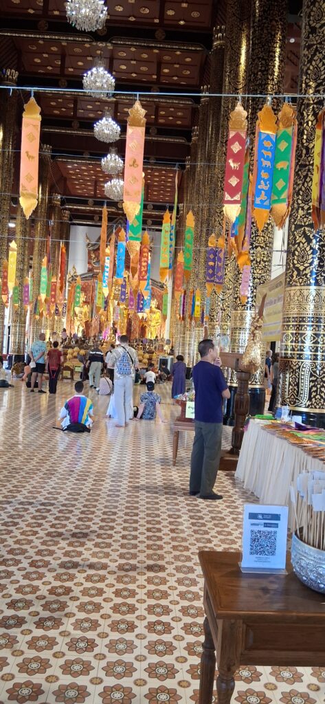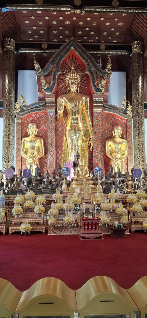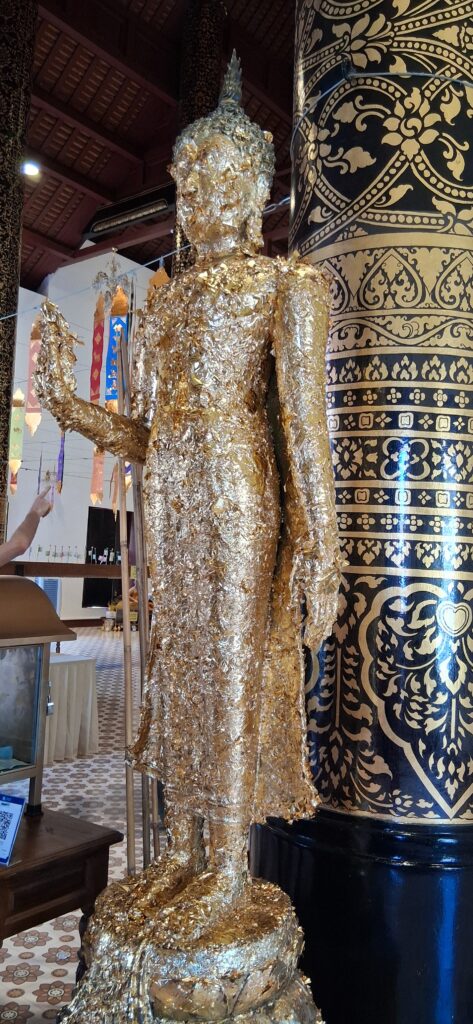 Près de là,  le grand temple du 14eme siècle avec son stupa en brique très haut et ses boudhas d’or. A l’intérieur on peut acheter une feuille d’or (hum, dorée) et la coller sur un des 7 petits boudhas d’or qui représentent chaque jour de la semaine.