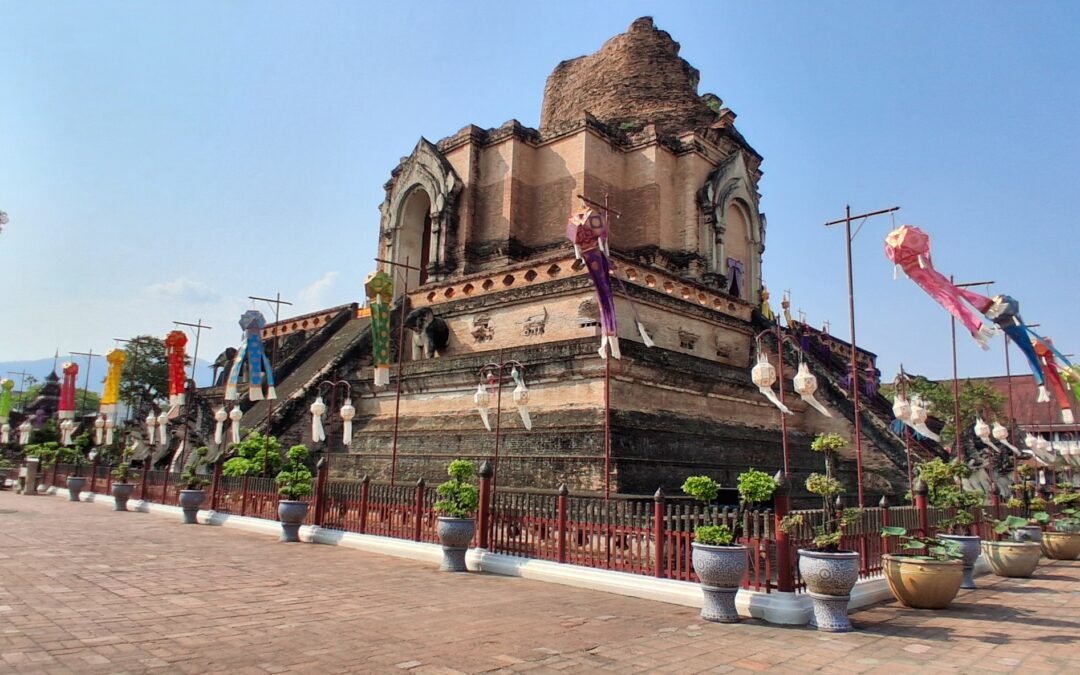 Près de là,  le grand temple du 14eme siècle avec son stupa en brique très haut et ses boudhas d’or. A l’intérieur on peut acheter une feuille d’or (hum, dorée) et la coller sur un des 7 petits boudhas d’or qui représentent chaque jour de la semaine.
