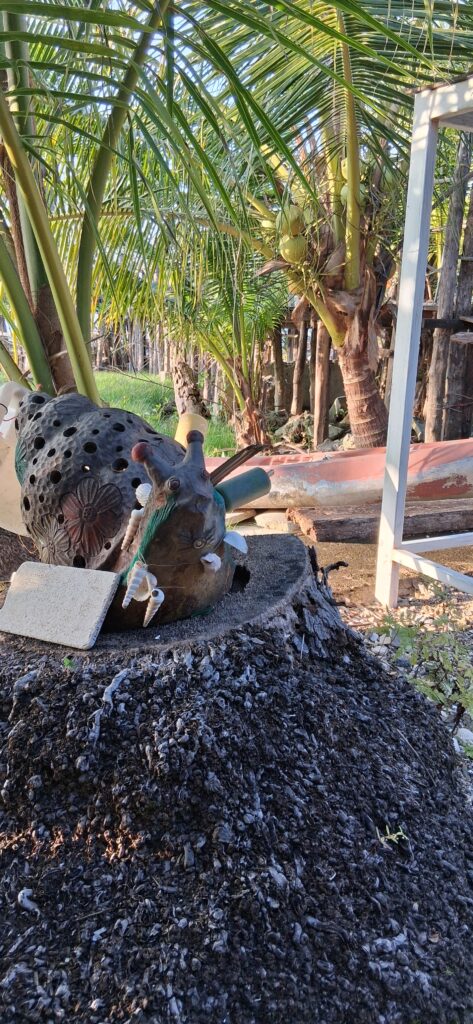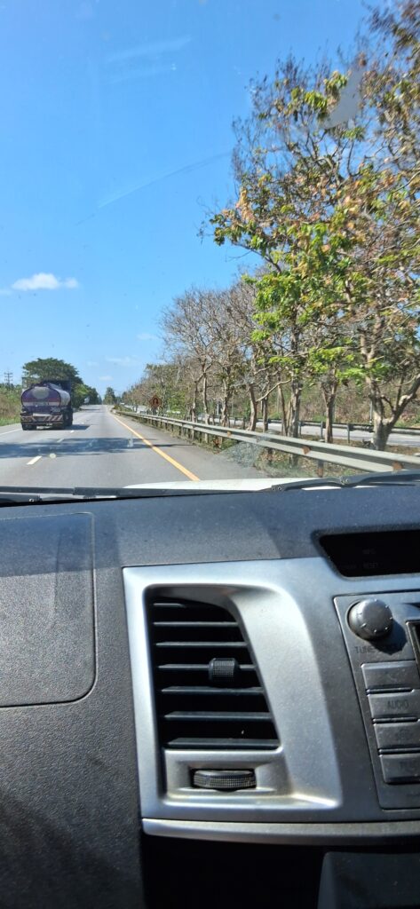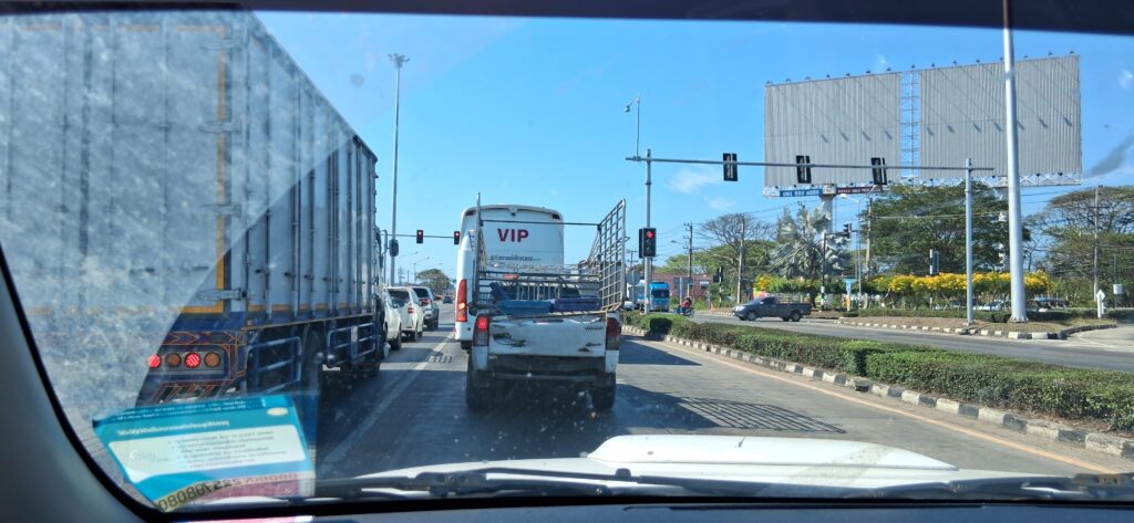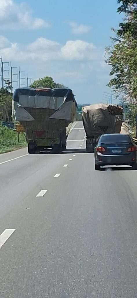Le trajet d’aujourd’hui est le même que celui du départ. On y fait quelques variantes pour couper la monotonie mais globalement on a déjà tout vu. Les camions et voitures surchargés de ballots, de cannes, de sacs de graines. Les vehicules lents sur la voie rapide, les scooters à contresens. Les cocotiers et les hévéas, les bassins de crevettes.