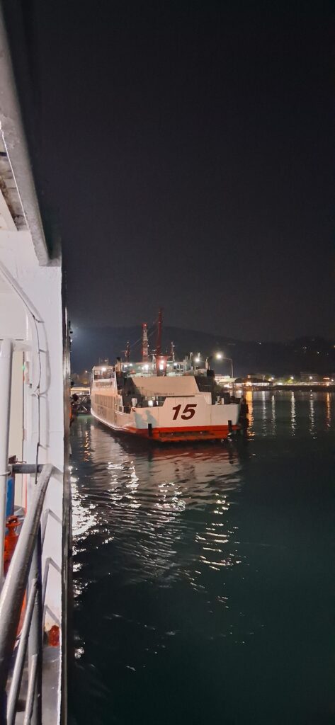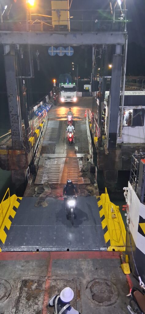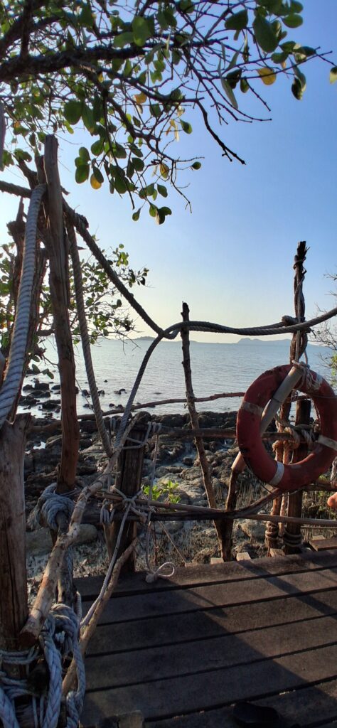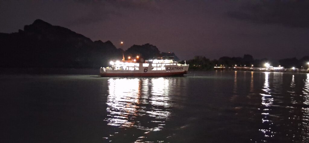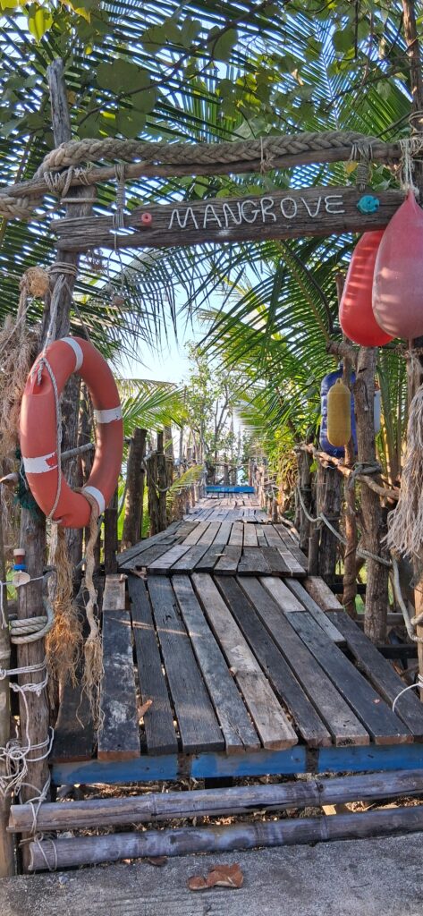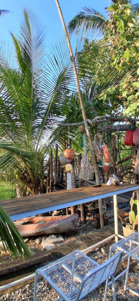 Après 3h de route, on cherche un lavage de voiture. Avant hier, mon frère a roulé sur du bitume frais, sa voiture blanche est marron. Une couche épaisse de goudron. C’est terrible. On trouve un laveur de voiture ouvert, qui a le produit ad hoc. Nous patientons dans le petit salon attenant en buvant un jus de fruits pendant que le laveur s’affaire. En 1h30 la voiture est décapée, mon frère rassuré. Et nous repartons pour les 3 dernières heures. Nous terminons par une variante pour contourner Surat tani côté mer, dans les marécages,bassins et canaux. Enfin nous arrivons au port avec une heure d’avance. Nous trouvons un joli bar en bois dans la mangrove autour, et nous buvons un verre tranquillement en attendant l’heure.