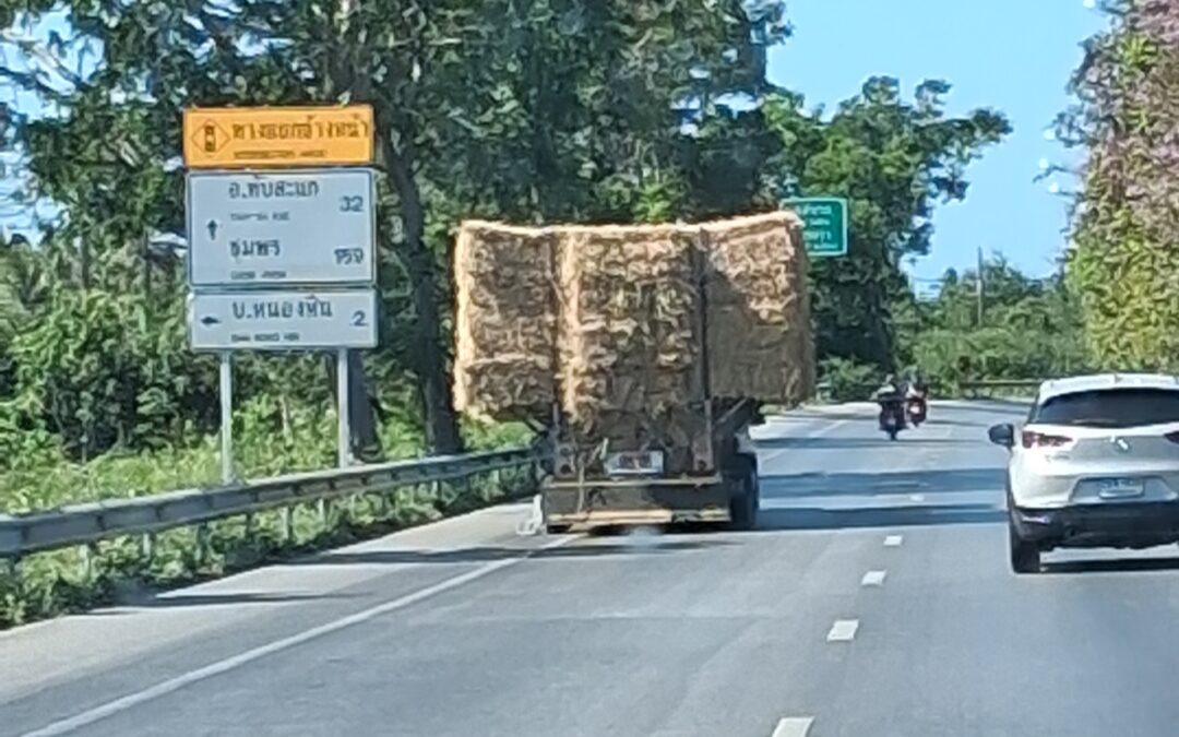 Le trajet d’aujourd’hui est le même que celui du départ. On y fait quelques variantes pour couper la monotonie mais globalement on a déjà tout vu. Les camions et voitures surchargés de ballots, de cannes, de sacs de graines. Les vehicules lents sur la voie rapide, les scooters à contresens. Les cocotiers et les hévéas, les bassins de crevettes.