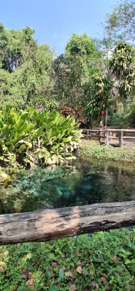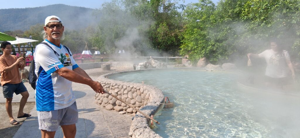 Aujourd’hui cap est mis sur des sources d’eau chaude à 45 km de Chiang Maï. C’est un grand parc aménagé avec des geysers jaillissant à 105 degrés, deux bassins d’eau bouillante où on peu faire cuire des oeufs. Ils vendent des petits paniers d’osier, on dépose les œufs et à l’aide d’une canne à crochet, on les accroche au bord d’un des bassins. Les temps de cuisson sont affichés !