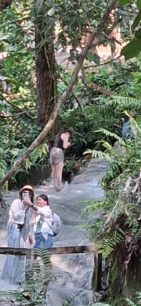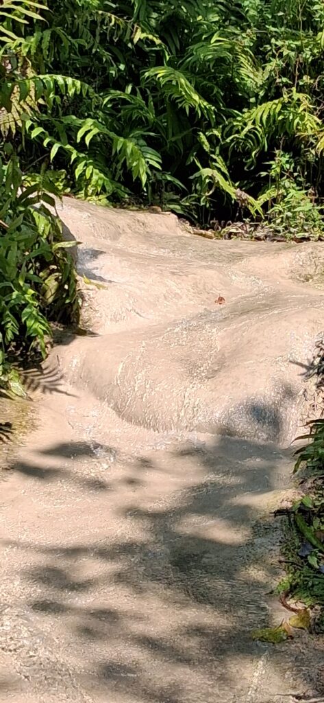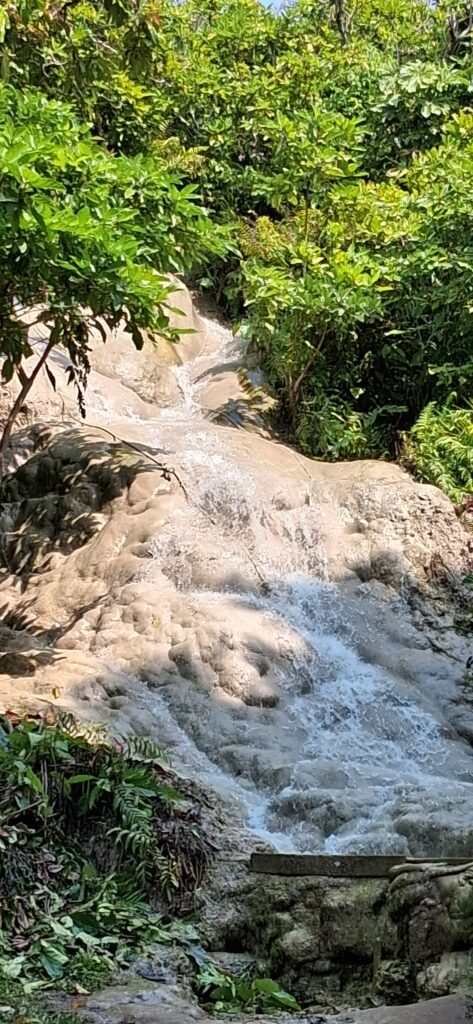 Les cascades collantes descendent dans un lit de calcaire (enfin un truc dans le genre) et malgré l’eau qui coule on peut marcher dessus et même les remonter à pied sans glisser. Avec la chaleur ambiante c’est une activité bienvenue. On descend par un escalier et on remonte les pieds dans l’eau, quelquefois avec l’aide d’une corde. C’est rafraîchissant et on s’amuse bien.