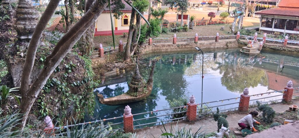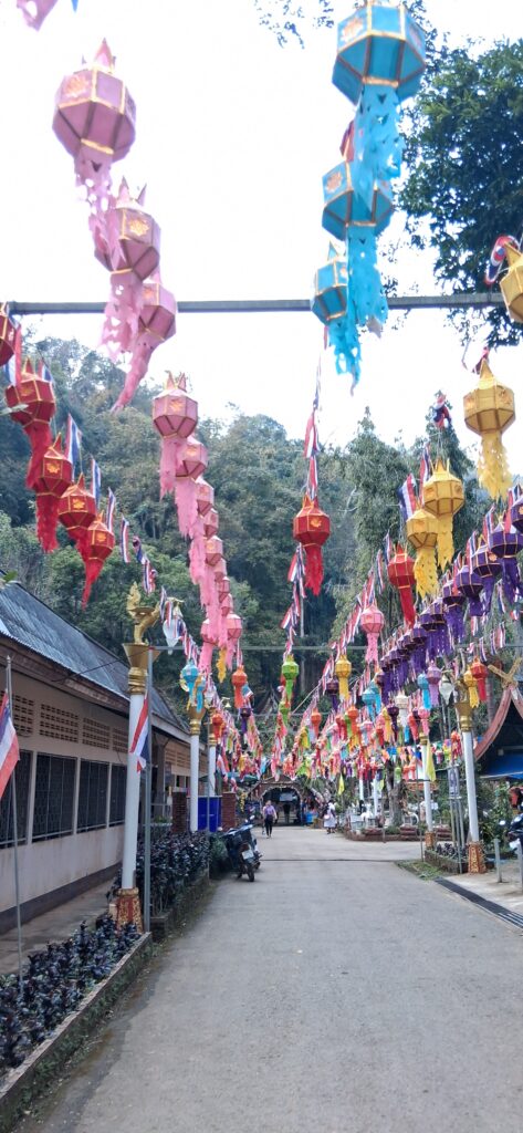 Un petit saut à pied jusqu’à un petit bassin translucide d’eau fraiche et nous repartons vers un temple au bord d’un étang. Il est entièrement décoré de lampions en papier de couleurs. La balustrade autour du bassin est recouverte de rubans de toutes les couleurs noués certainement pour faire des vœux.