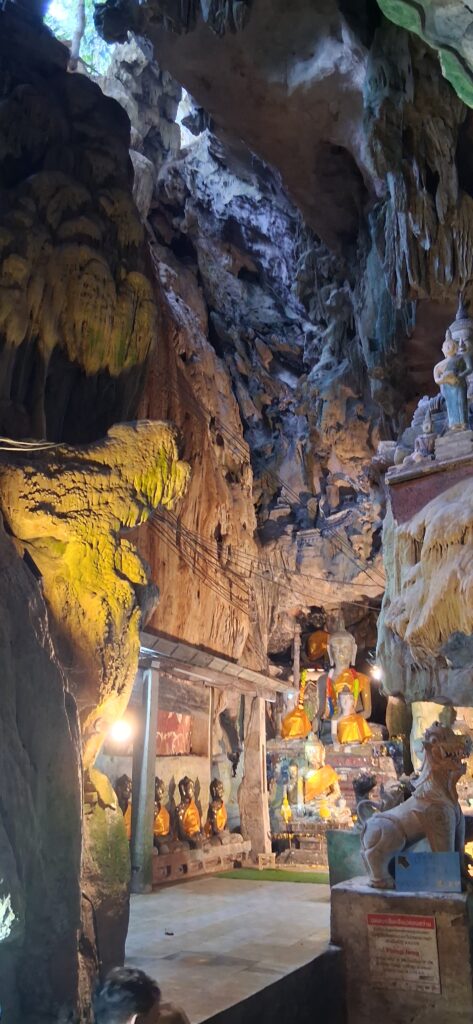 Après quelques marches d’escalier il y a une longue grotte dans laquelle on peut voir des bouddhas centenaires et un boudha allongé sur le dos comme un gisant. Les gens viennent se recueillir devant lui. La grotte souffre de trop de lumière et trop de visiteurs, la mousse se dépose sur les drappés, les stalactites.