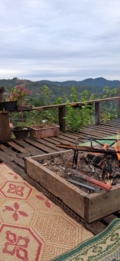 Les chiens ont aboyé jusqu’à presque 1h du matin, les coqs ont pris le relai à 5h ! Sans parler de la route et des camions qui passent. Vive la campagne ! Inutile de dire que la nuit a été courte ! Ce matin je regarde la vie qui redémarre, la poule ses petits poussins à ses trousses, le chien qui vole une banane, detache la peau et la mange, la grand-mère qui fait un feu de bois sur la terrasse. C’est là que nous prenons le café , sur la terrase autour du feu de bois. Décidément, le feu de camp nous suit. Le propriétaire de l’hôtel fait une vidéo avec nous pour son ghesthouse. Il faut dire qu’il aurait été vide si on ne s’était pas arrêté là hier. Nous ne sommes pas sur une route touristique.