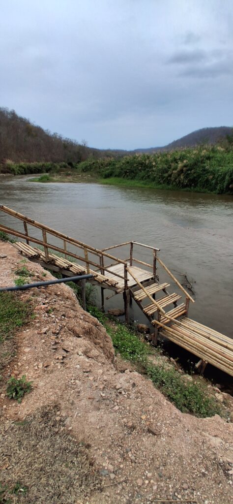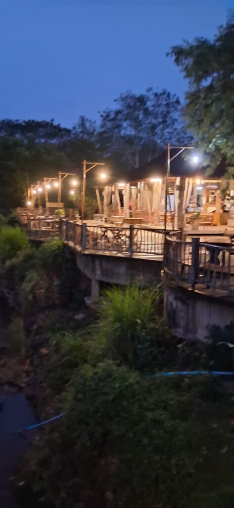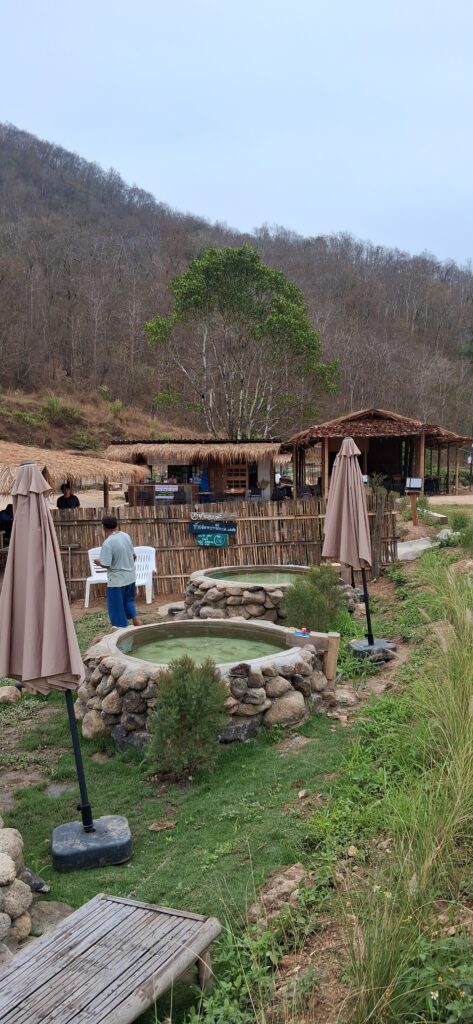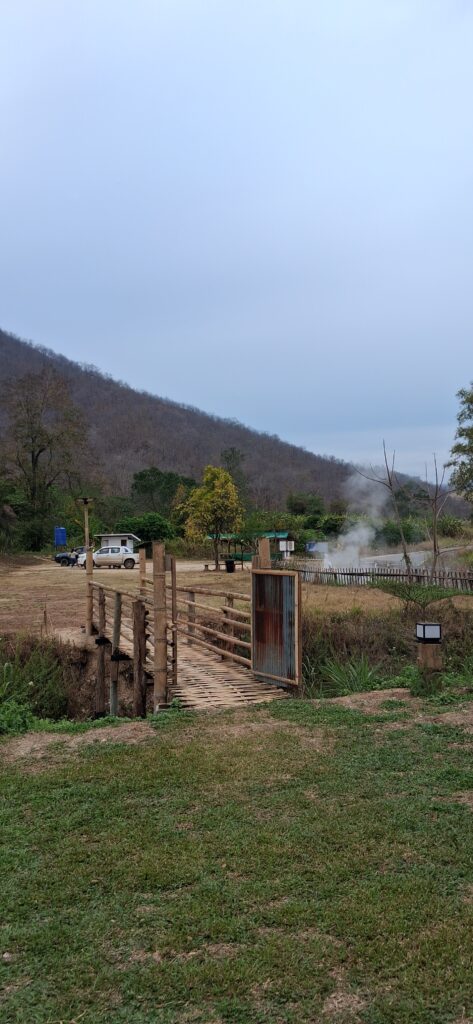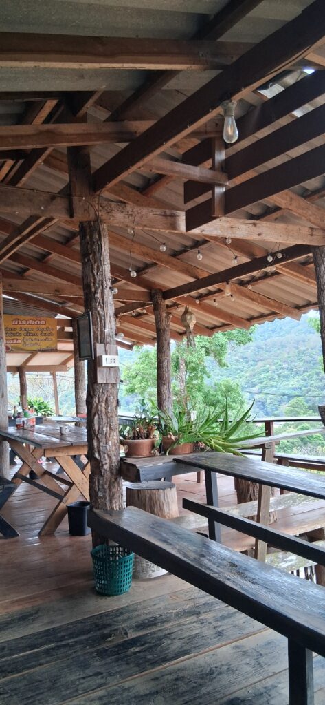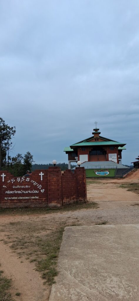 D’ailleurs nous allons continuer cette route jusqu’à la ville de Paï à 70km de là, 2h de route. Virages, nids de poule. Mais aussi petits villages, champs de fraises, pinèdes, petits cafés. On s’arrête dans l’un d’eux pour prendre un vrai petit déjeuner car ce matin ce n’était qu’un café. A l’entrée du village, il y avait un petit cimetière avec des croix. Et au dessus du café il y a une grande église. Ce village semble Chrétien. Il faut dire que dans ses montagnes il y a plusieurs ethnies et certaines parlent à peine le thaï.