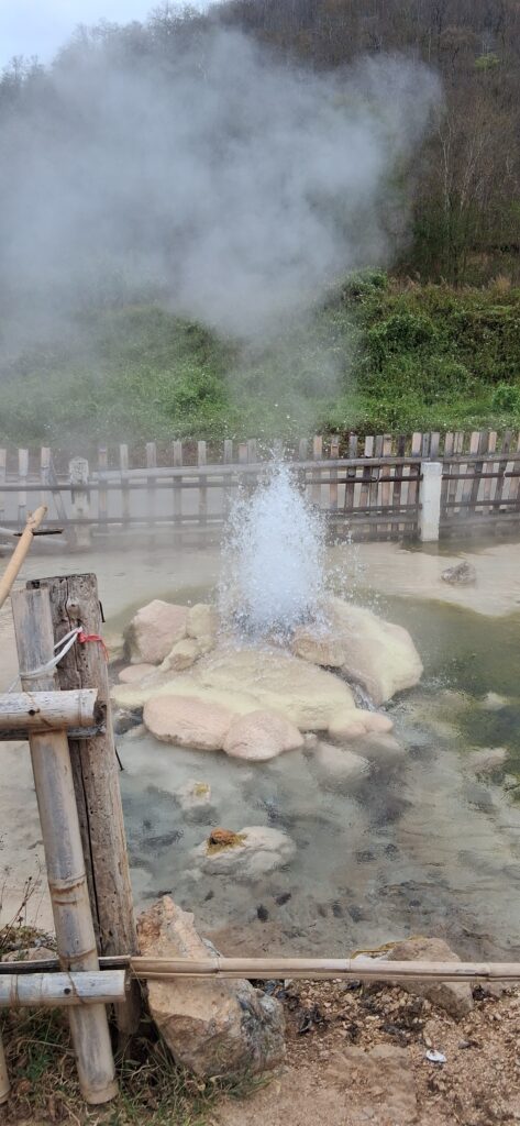 Un autre arrêt devant un jaillissement d’eau chaude en bord de route. L’eau chaude se déverse dans la rivière toute proche. C’est très surprenant. Un bar a été aménagé là avec une piscine chaude et des petits bassins ronds où on peut se détendre en se trempant les pieds.
