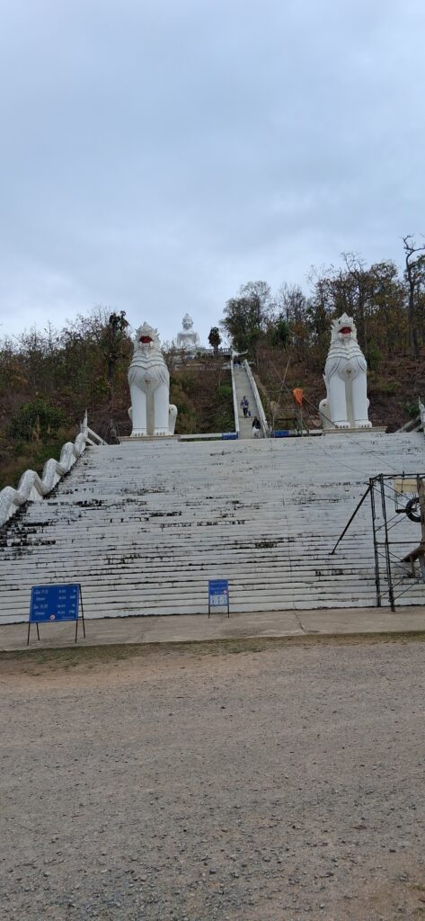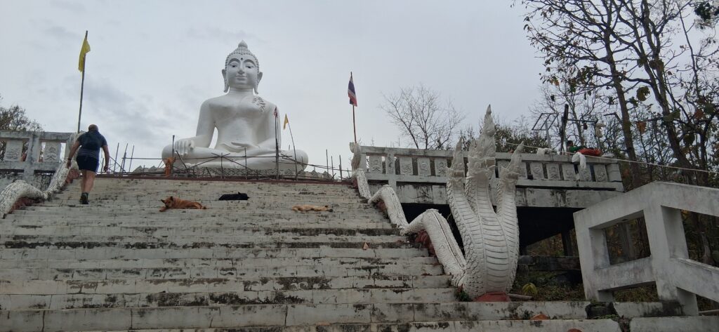 Il pleut aujourd’hui, nous avons sorti les Kway pour partir à l’assaut du bouddha blanc tout en haut de sa colline. Un escalier vertigineux y conduit. De là haut on a un très beau panorama de la ville et des montagnes au fond.