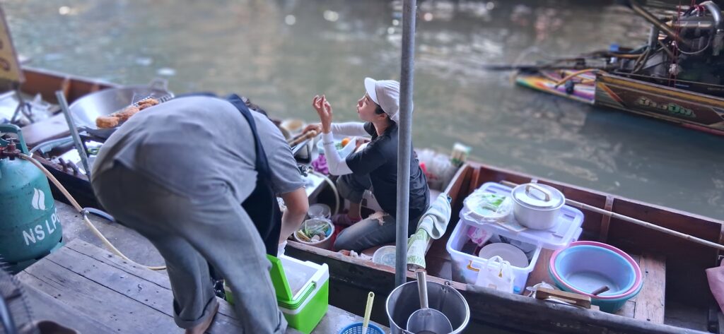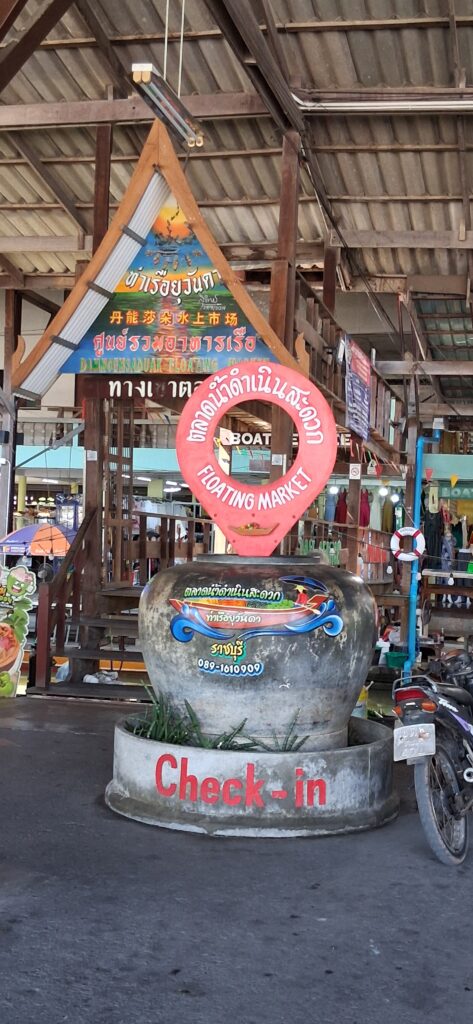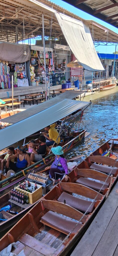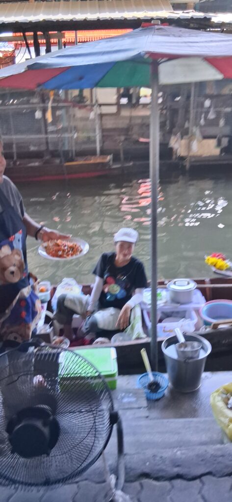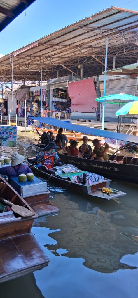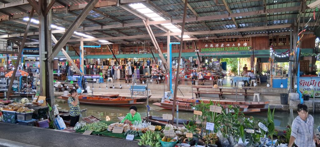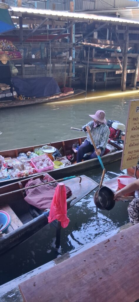 Cap est mis sur le marché flottant de Donsuak. Un marché flottant, c’est un peu le truc à voir en Thaïlande. Ca se passe sur un ou des canaux. Les vendeurs mettent leur marchandise sur leur barque et vendent depuis les barques. Les clients peuvent aussi se balader en barque et les accoster, ou à pied depuis le quai. Le marché de Donsuak est le plus réputé de Thaïlande. Il est situé à une heure environ de Bangkok ce qui fait que des tours operators emmènent les touristes par cars entiers tous les matins.
