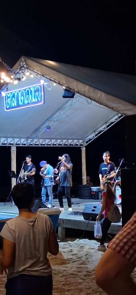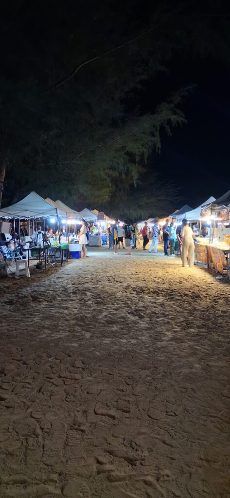 Près de l’hotel se tient un marché de nuit , les pieds dans le sable, avec un orchestre qui joue de la musique Thaï très entraînante.