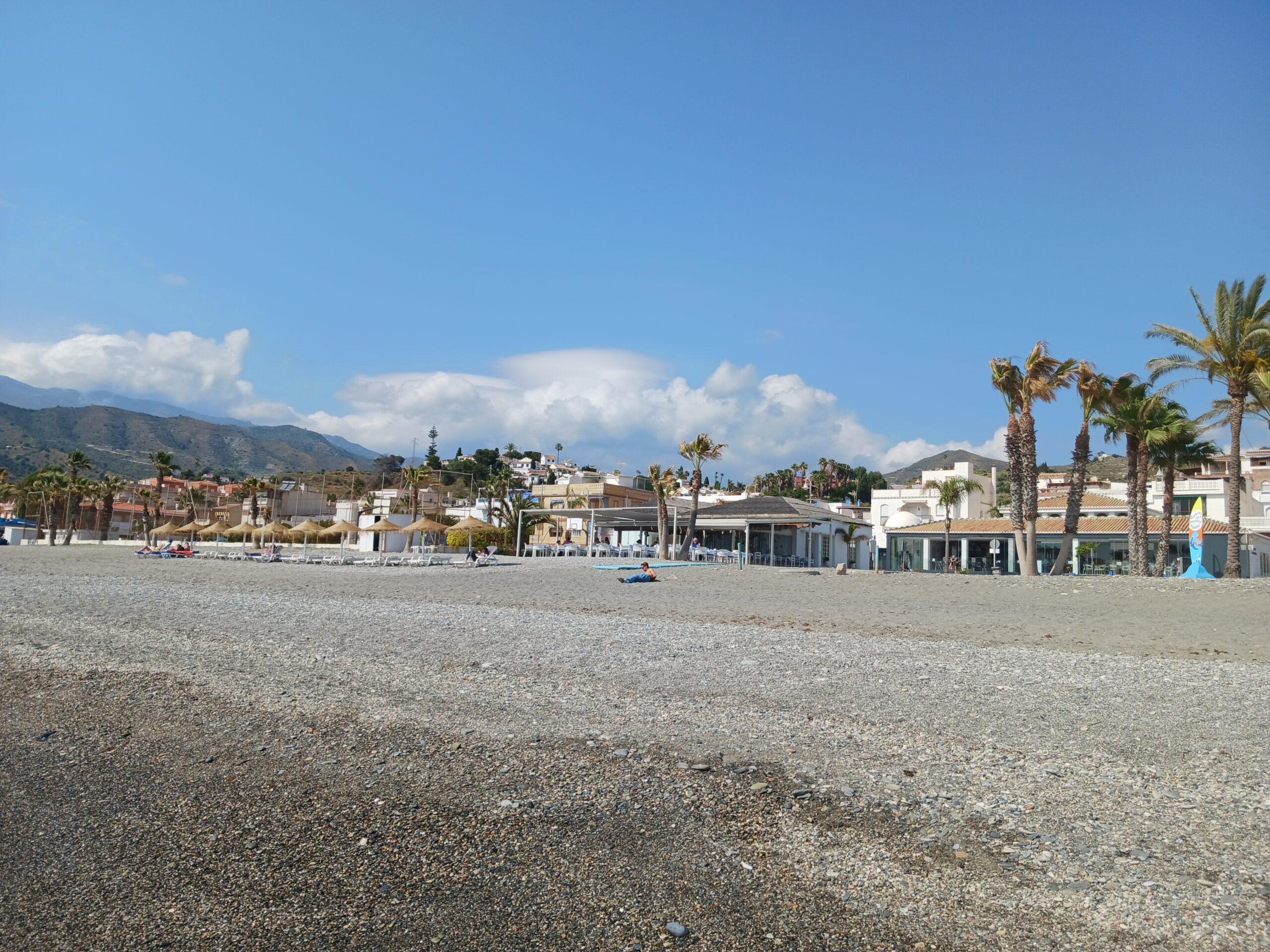 Nous descendons sur la mer à Herradura. C’est joli. Il fait un peu frais aujourd’hui et le temps est couvert. Nous nous trempons les pieds. Ca fait du bien. C’est une plage de petits galets.