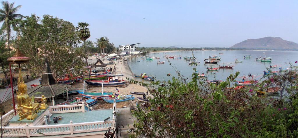 La journée démarre par un bon petit déjeuner face à la mer et son levé de soleil. Puis cap est mis sur le wat oa noi, joli temple avec un petit étang en bord de mer. Des barques de pêcheurs multicolores parfaitent le décors. Mais ce que nous sommes venus visiter, c’est la grotte à laquelle on accède en grimpant la colline par des marches et où se trouvent 2 immenses bouddha couchés dorés. C’est très beau.