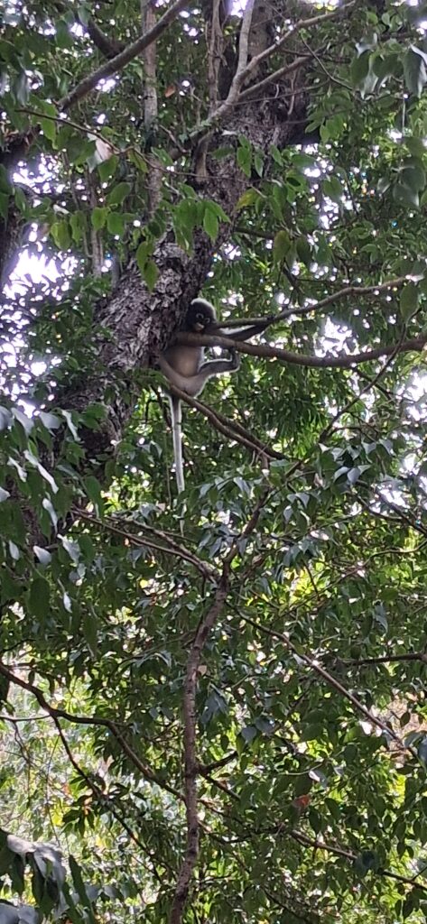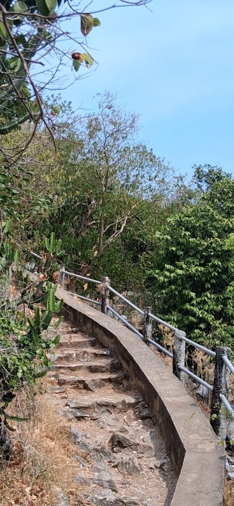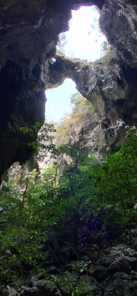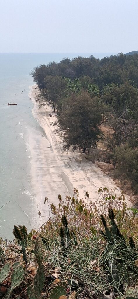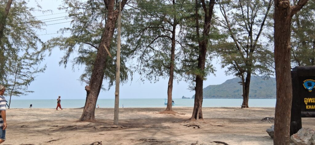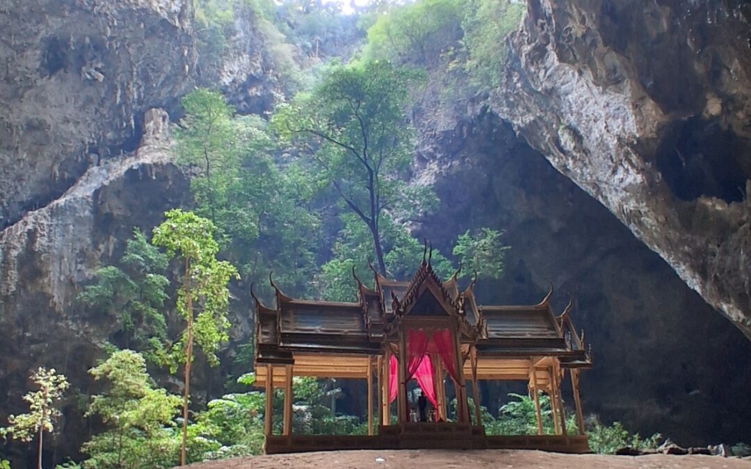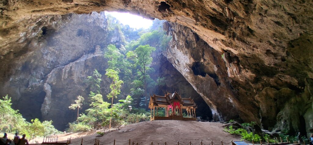 De là on repart vers le phraya nakon cave à quelques kilomètres. C’est un petit temple ou autel érigé par un ancien roi au fond d’une grotte ouverte, verdoyante et où le soleil illumine le temple. Il est très célèbre en Thaïlande. Mais il faut le vouloir. L’accès se fait en passant par dessus une première colline , on arrive alors sur une plage que l’on traverse pour attaquer la montée d’une deuxième colline et redescendre dans la grotte. Ils préviennent en bas de tester sa condition physique, et à chaque pallier un agent de sécurité avec son matériel médical (….) surveille ou somnole !