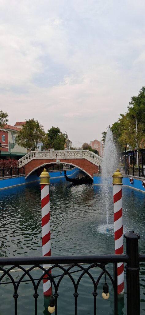 On repart vers le nord en longeant la mer. La végétation a changé, plus de plantations, maintenant des marais et des bassins d’élevage de crevettes longent la route. De temps en temps, un temple adossé aux montagnes qui surgissent ça et là, un boudha immense dressé, assis ou couché qui émerge au loin. La mer à droite. On roule jusqu’à Hua Hin, grande ville de bord de mer, où il faut reprendre la route principale embouteillée. Heureusement on trouve une parallèle plus calme pour sortir au plus vite de la ville. Là on débouche sur le Siam Venezia, un parc qui reproduit Venise en mignature. Il n’y a personne, les boutiques sont vides, on se croirait dans un monde déserté ! On trouve quand même un petit restaurant ouvert où on mange des petites pizzas surgelées et mal cuites, ignobles !
