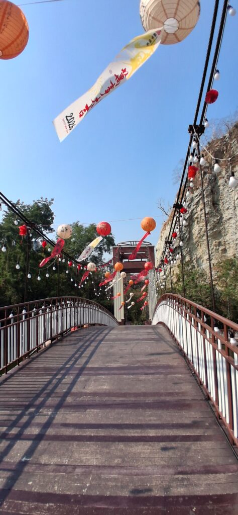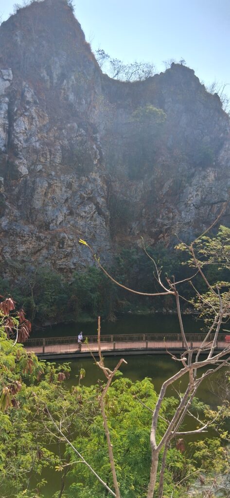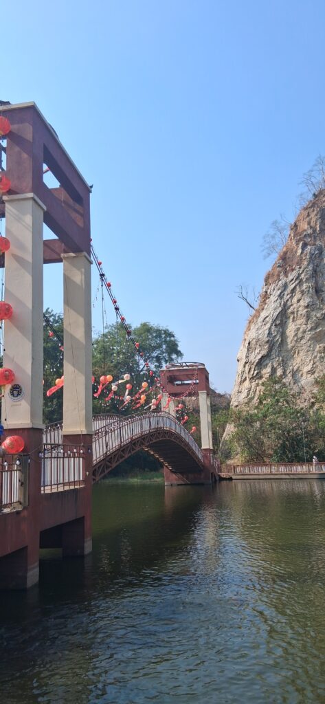 L’hotel ne fait pas de petit déjeuner. Il y a un café près du centre commercial d’hier soir. Mais pas de pain, gateau, brioches ! Ce sera un thé avec des crackers à l’ananas et un cookie à la banane ! Puis on part visiter le très vieux temple de Ratchaburi (10ème siècle) et 6km plus loin le Hin Khao Ngu Park. C’est un étang entre des monts rocheux aménagé avec un joli pont. Entre la saint valentin de demain et le nouvel an chinois dans une semaine, le parc est décoré de boules en papier chinoises et de guirlandes de lumières. Il y a des singes partout qui s’approchent des touristes pour attraper de quoi manger ! Ils ne sont pas très sauvages, juste ce qu’il faut.