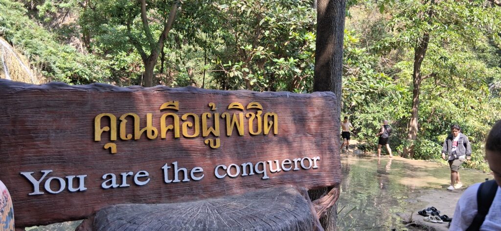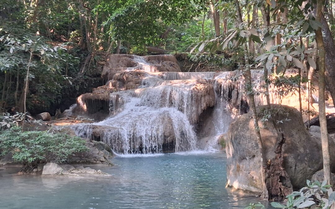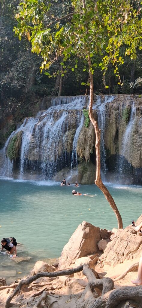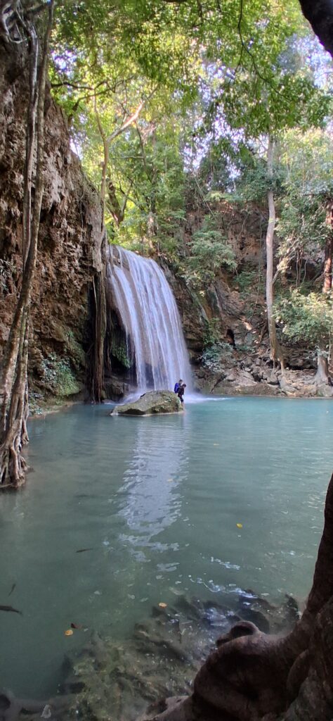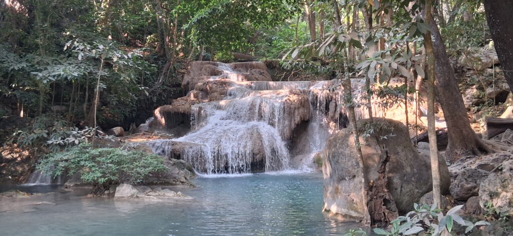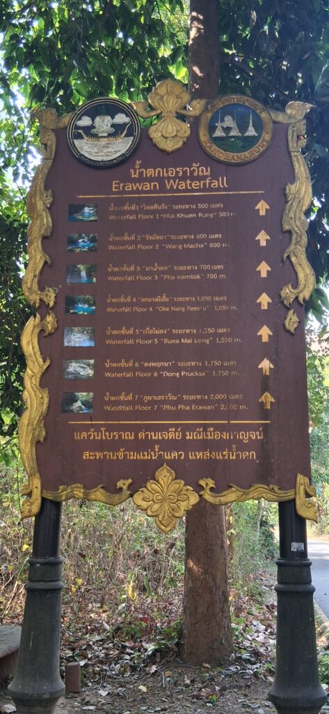 Après un bon petit déjeuner pris sur la terrasse du bungalow flottant, nous partons pour le parc national d’Erawan, faire la randonnée des 7 cascades. 7 niveaux sur 2km. Les guides annoncent une randonnée difficile, finalement, aucune difficulté, rien à voir avec ce qu’on a fait avant hier pour visiter la grotte.