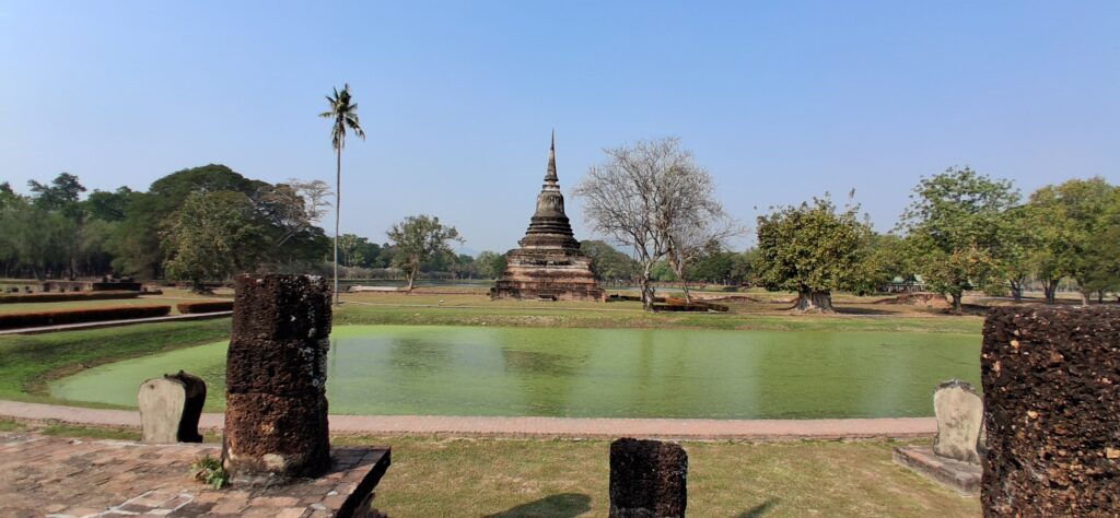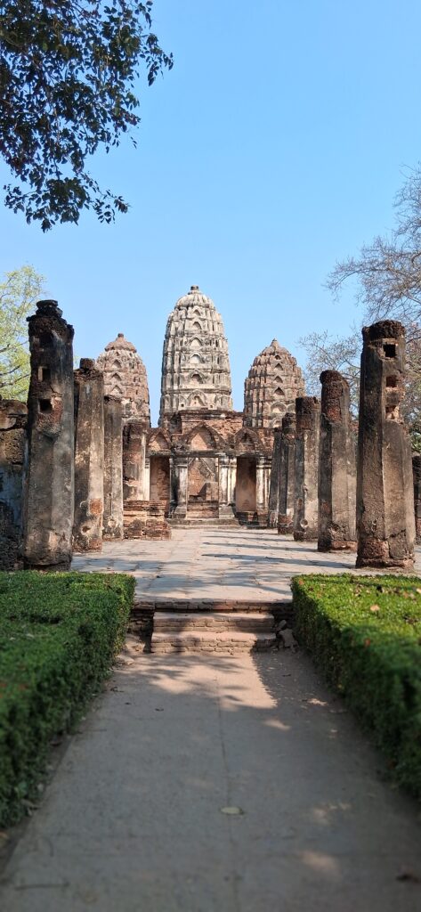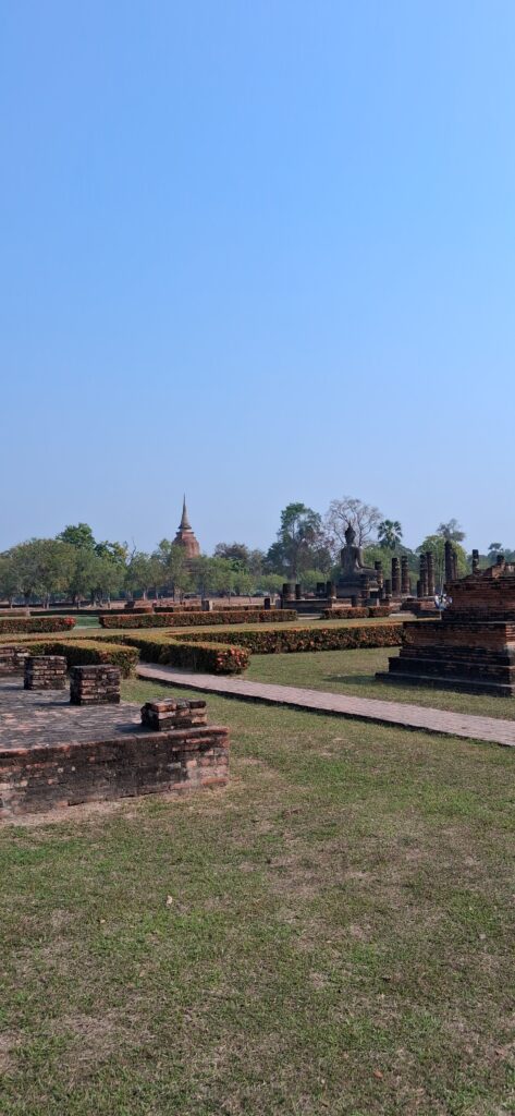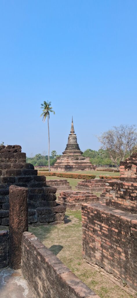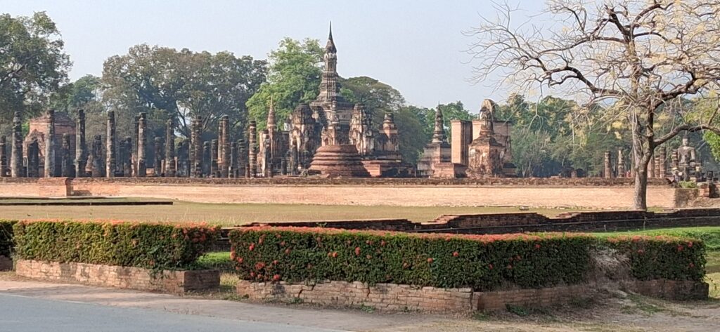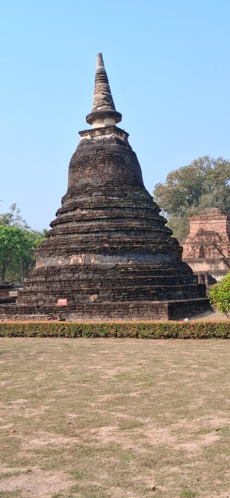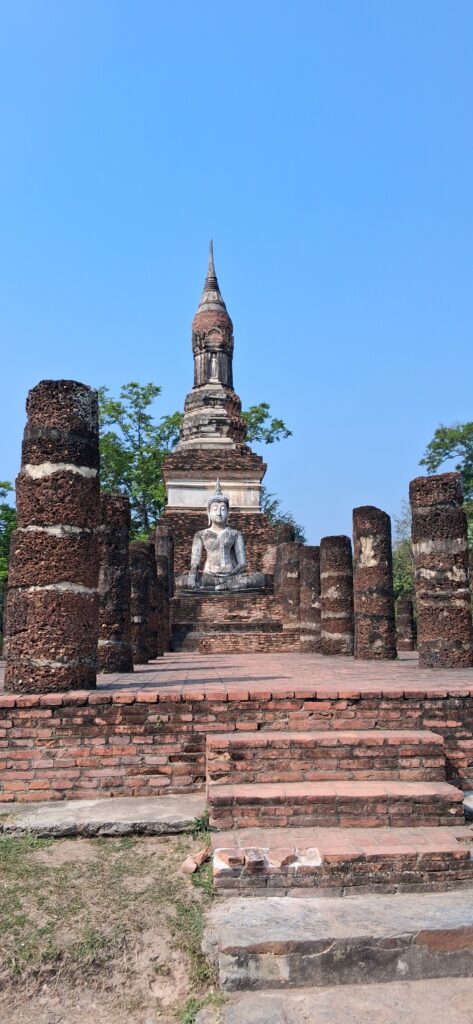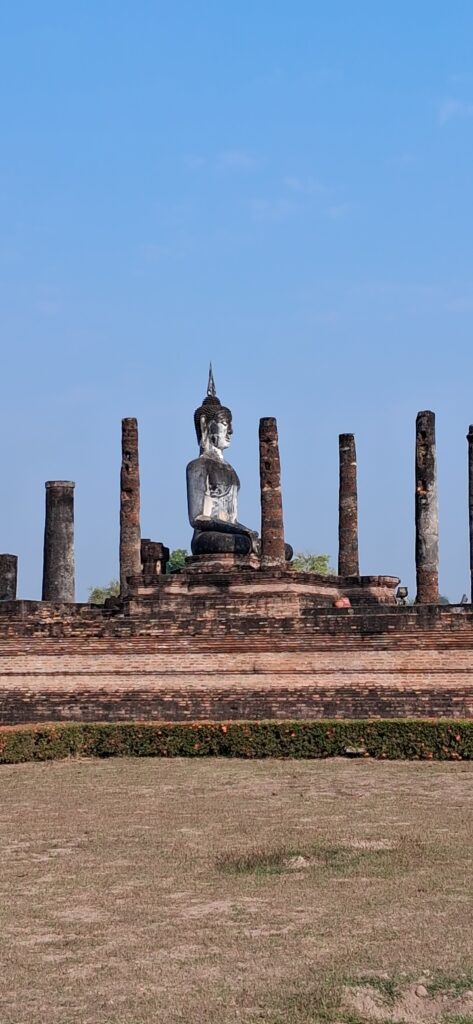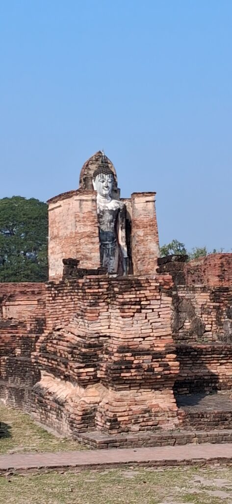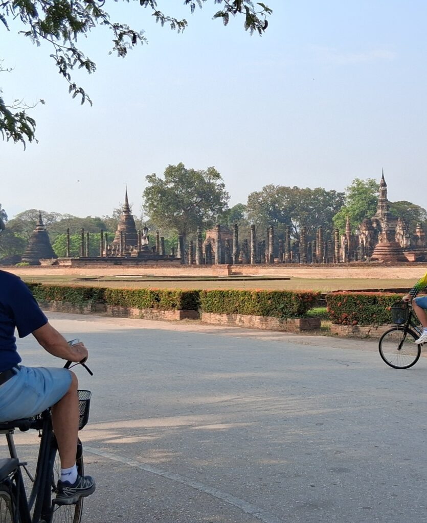 La cité antique de Sukhothai se visite à vélo, l’hôtel nous en prête 3. Nous partons à la fraiche pour éviter les grosses chaleurs. L’entrée du parc est payante y compris pour les vélos ! Du coup, c’est très propre, très bien entretenu. Nous pédalons dans les larges allées entre les différents temples. C’est très calme, apaisant, tranquille. Nous laissons les vélos devant chaque entrée de temple pour rentrer sur les sites. Cette ancienne cité a été la capitale de la Thaïlande au 13ème siècle. Ces temples en briques noircies par le temps et peut-être la pollution… sont assez bien conservés maintenant. Bien sûr ils ont perdu leurs toits et leurs murailles mais on peut deviner leur ancienne beauté. C’est un peu comme les temples egyptiens ou plus proches, nos vestiges romains.