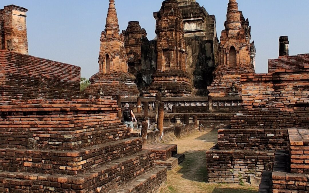 La cité antique de Sukhothai se visite à vélo, l’hôtel nous en prête 3. Nous partons à la fraiche pour éviter les grosses chaleurs. L’entrée du parc est payante y compris pour les vélos ! Du coup, c’est très propre, très bien entretenu. Nous pédalons dans les larges allées entre les différents temples. C’est très calme, apaisant, tranquille. Nous laissons les vélos devant chaque entrée de temple pour rentrer sur les sites. Cette ancienne cité a été la capitale de la Thaïlande au 13ème siècle. Ces temples en briques noircies par le temps et peut-être la pollution… sont assez bien conservés maintenant. Bien sûr ils ont perdu leurs toits et leurs murailles mais on peut deviner leur ancienne beauté. C’est un peu comme les temples egyptiens ou plus proches, nos vestiges romains.